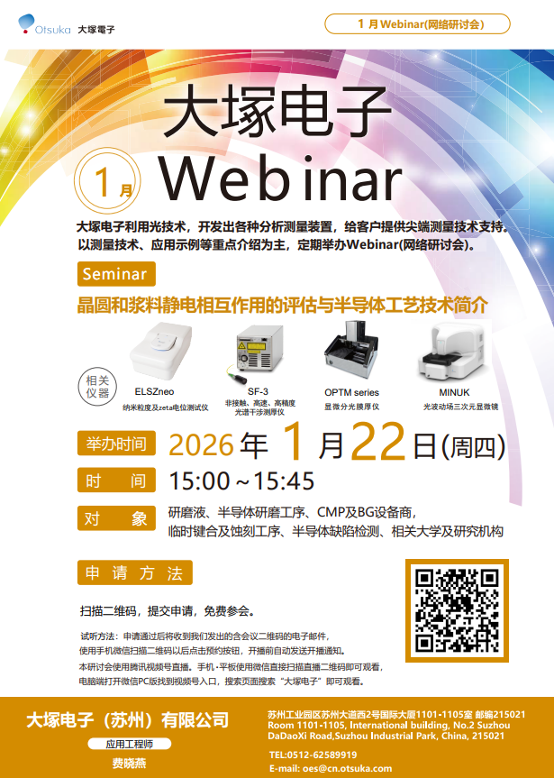 大塚電子的 Zeta 電位測量系統“ELSZ 系列”不僅可以測量溶液中膠體粒子的 Zeta 電位,也可以測量平板狀、薄膜狀樣品的 Zeta 電位。通過這樣的測量可以評價平板狀樣品的表面改質狀態以及液體中粒子的吸著特性。本次研討會將介紹其應用。